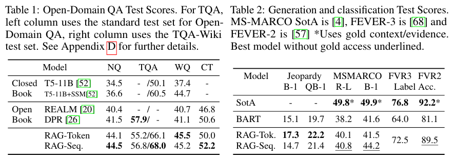 REALM이라는 또 다른 Retrieval을 사용한 방법이 있고 앞서 언급했던 오리지널 DPR에 비해 대체로 RAG가 더 좋은 성능임을 알 수 있다.