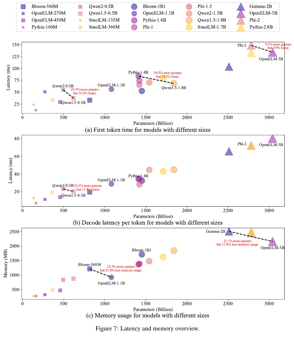 첫 토큰 생성 시간에서 OpenELM 3B, 그리고 Qwen1.5 0.5B와 1.8B가 더 빨랐으며,