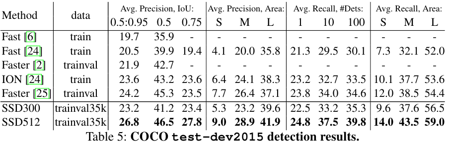 Table 1, 4, 5를 보면 SSD가 대체로 좋은 성능을 보인다.