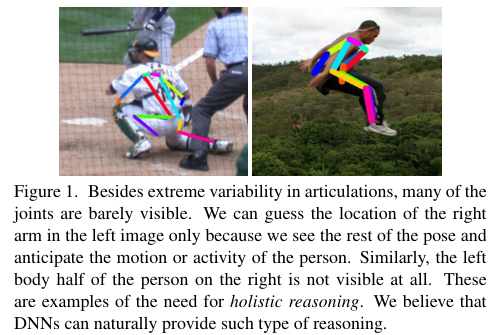 DNN (Deep Neural Network) 기반의 regression 문제로 해석해서 사람의 신체 관절 (body joints)를 통한 pose estimation을 수행한다. Pose에 대한 설명과 동시에 4가지 학술적인 벤치마크에서 좋은 성능을 냈다.