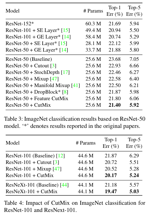 Table 3과 4에서는 이미지 분류에 대해서 CutMix를 적용한 성능을 보여주는데 베스트임을 알 수 있다.