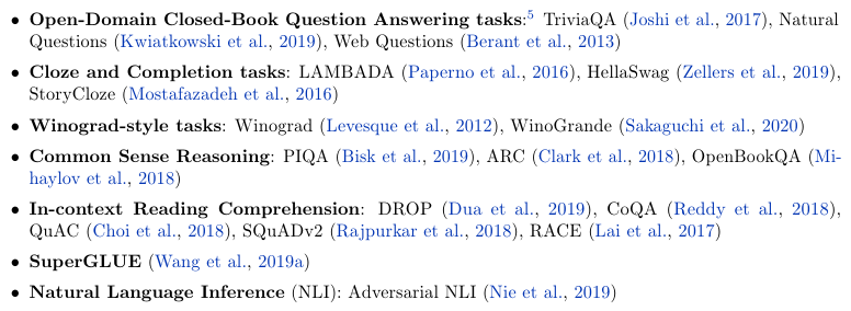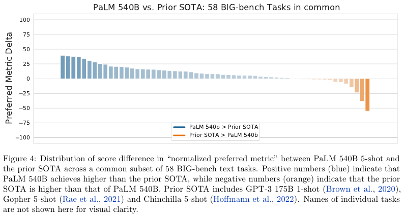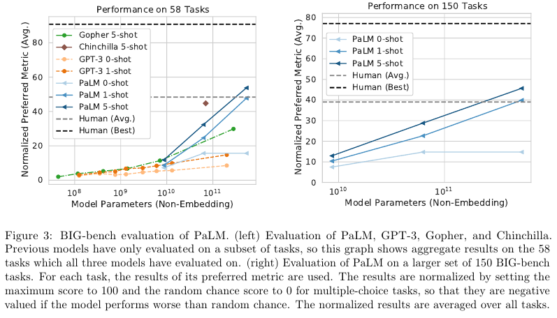 • Continued improvements from scaling – 저자들은 PaLM을 몇백개가 넘는 자연어와 코드, 그리고 수학적 추론에서 평가했는데 많은 부분에서 SOTA를 달성했다. 이는 GPT-3, GLaM, Megatron-Tuning NLG, Gopher, Chinchilla, LaMDA와 겨룰만하다.