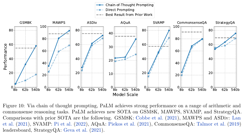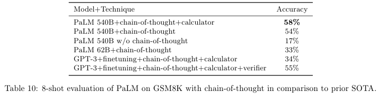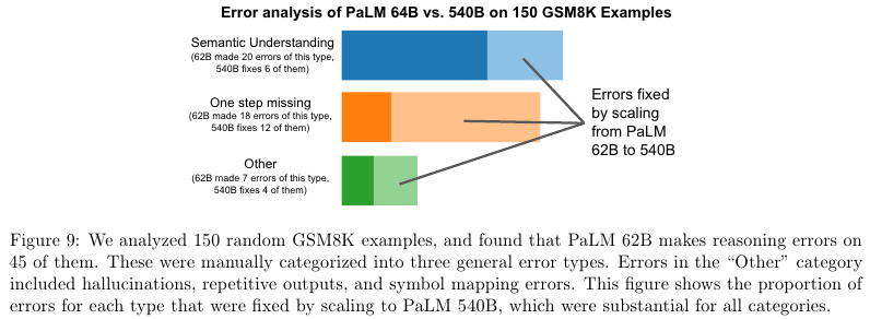 • Discontinuous improvements – Scaling behavior를 더 잘 이해하기 위해서, 서로 다른 세 가지 스케일인 8B, 62B, and 540B의 모델을 실험했다. 8B에서 62B로 키울 때는 Power law 룰 모양에 근거한 일관적인 성능의 향상을 보였다. 하지만 62B를 540B로 늘렸을 때는 급격한 정확성의 향상이 있었다.