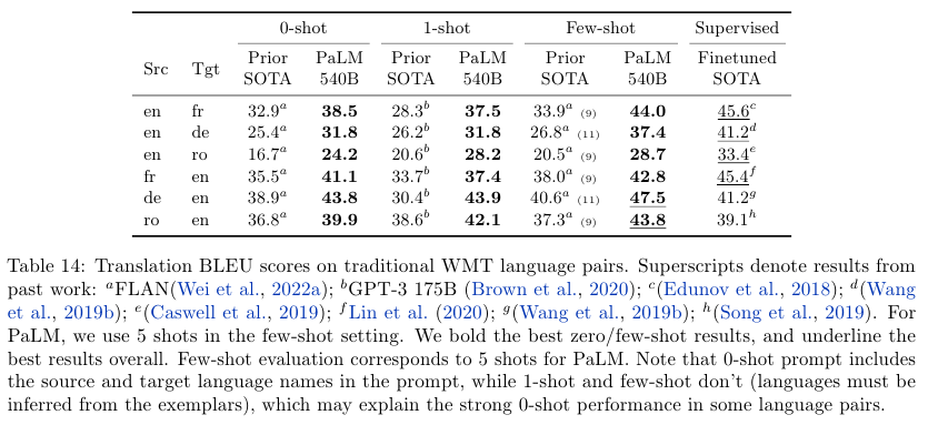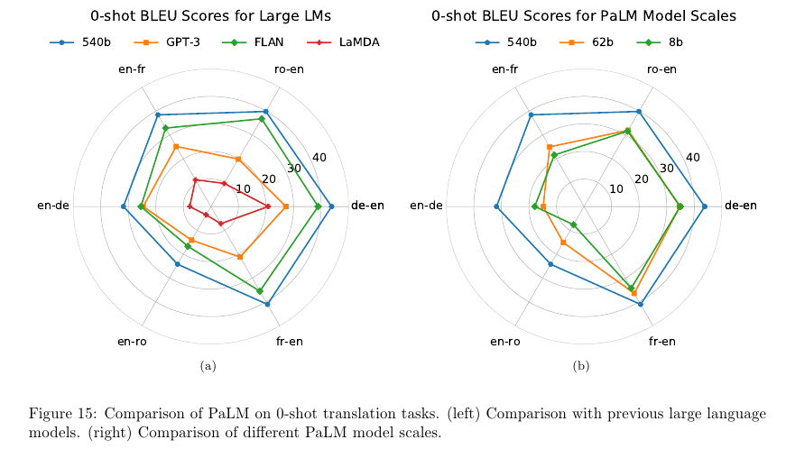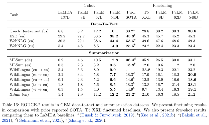• Multilingual understanding – Machine translation, summarization, question answering을 포함한 다양한 분야에서, 다국어에 대해서 성능을 측정했다. 비 영어 데이터가 22%에 불과했지만 퓨샷 성능 평가를 통해서 540B 모델이 비영어 요약 태스크에서