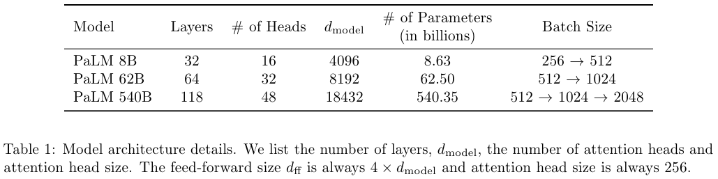 PaLM 모델에 대한 자세한 내용은 아래 Table 1에 소개되어있다.