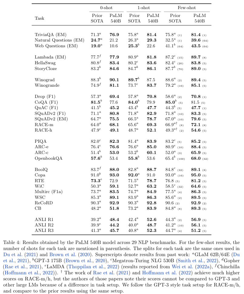 LLM은 퓨샷 학습(Few-shot learning)을 사용하여 다양한 자연어 태스크에서 놀라운 성능을 달성했니다. 이는 특정한 애플리케이션에 모델을 적용하는 데 필요한 작업별 학습의 사례 수를 대폭 줄여준다. 퓨샷 학습에 대한 규모의 영향을 더 잘 이해하기 위해, Pathways Language Model (PaLM)이라고 명명한 540 billion 개의 매개변수를 가진 Densely Activated 트랜스포머 언어 모델을 학습했다.