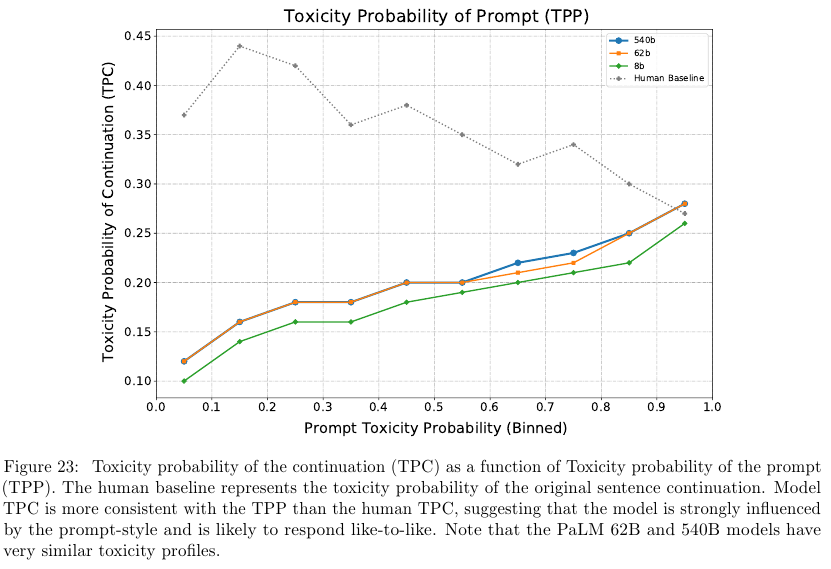 • Bias and toxicity – 또한 분포 편향과 독성에 대한 모델 성능을 평가하여 몇 가지 통찰력을 얻게 되었다 (섹션 10). 첫째, 성별 및 직업 bias 편향의 경우, Winogender coreference task 상호 참조 과제의 정확도가 모델 규모에 따라 향상되고, PaLM 540B는 원샷 및 퓨샷에서 새로운 SOTA를 제시한다. 둘째, 인종 / 종교 / 성별 prompt continuation 프롬프트 연속 과제에 대해 수행된 co-occurence analysis 동시 발생 분석은 모델이 고정관념을 잘못 긍정할 가능성을 보여준다. 예를 들어, 무슬림을 테러리즘, 극단주의, 폭력과 연관시키게 된다. 이러한 현상은 여러가지 규모의 모델 전반에 걸쳐 일관되게 나타났다. 마지막으로, 프롬프트 연속 과제에 대한 toxicity 독성 분석은 8B 모델에 비해 62B 및 540B 모델의 전반적인 독성 수준이 약간 더 높음을 보여준다. 그러나 모델에서 생성된 연속 문장의 독성은 프롬프트 텍스트의 독성과 높은 상관관계를 보이는 반면, 인간 생성 연속 문장은 독성과 강한 상관관계를 보이지 않았다. 이는 모델이 인간 생성 텍스트보다 프롬프트 스타일의 영향을 더 크게 받는다는 것을 시사한다. 향후 연구에서는 이러한 기준을 영어가 아닌 언어로 확장하고 잠재적 위험을 더욱 철저하게 고려할 계획이다.