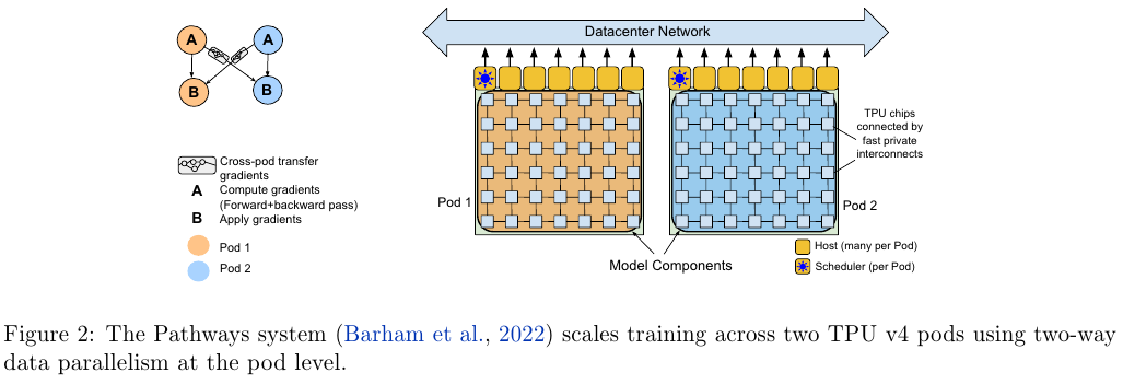 Pathways는 2개의 Pods이 각각 별도로 데이터를 받은 다음 그라디언트를 계산한다. 그리고 이를 서로 공유하여 파라미터를 업데이트 하게 된다.