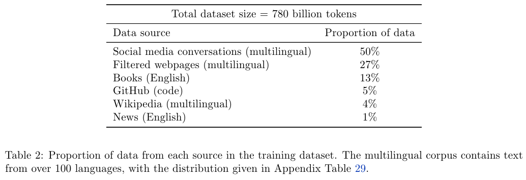 고품질의 코퍼스로 구성된 780 billion tokens로 PaLM을 학습했다. 데이터응 Filtered webpages, books, Wikipedia, news articles, source code와 social media converstaions로 구성된다. LaMDA와 GLaM을 학습할 때 썼던 데이터셋에 기반한 데이터셋이다.