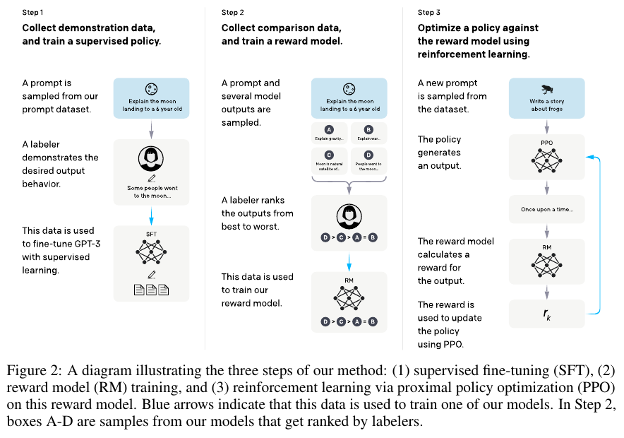 라벨러가 작성한 프롬프트 집합을 시작으로 모델의 바람직한 행동에 대한 라벨러들의 의견을 모아서 supservised learning 지도 학습을 수행했다. 모델의 출력에 대한 랭킹 데이터를 수집한 다음 reinforcement learning from human feedback (RLHF)를 지도 학습을 적용했다. 결과로 나온 모델을 InstructGPT라고 부르고 175B GPT-3보다 훨씬 100x 이하의 적은 파라미터를 가지면서도 좋은 성능을 달성하였다.