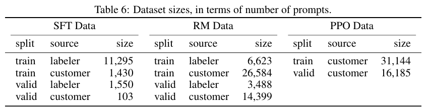 SFT 데이터셋에는 약 13,000개의 훈련 프롬프트(API 및 레이블러 작성)가 포함되어 있고, RM 데이터셋에는 33,000개의 훈련 프롬프트(API 및 레이블러 작성)가 포함되어 있으며, PPO 데이터셋에는 31,000개의 훈련 프롬프트(API에서만)가 포함되어 있다.