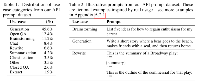 데이터셋 구성에 대한 감을 잡기 위해 Table 1에서는 계약자가 레이블링한 API 프롬프트(특히 RM 데이터셋)의 사용 사례 범주 분포를 보여준다. 대부분의 사용 사례는 분류 또는 QA보다는 생성적입니다.
