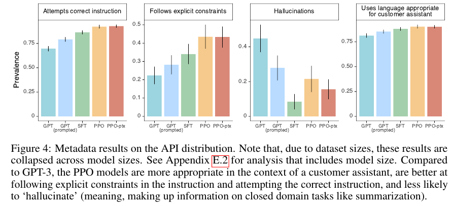Hallucinations 환각을 제외하면, 즉 groundedness를 제외하면 PPO-ptx가 좋은 성능을 달성했음을 알 수 있다.