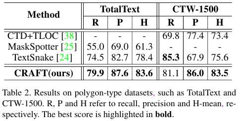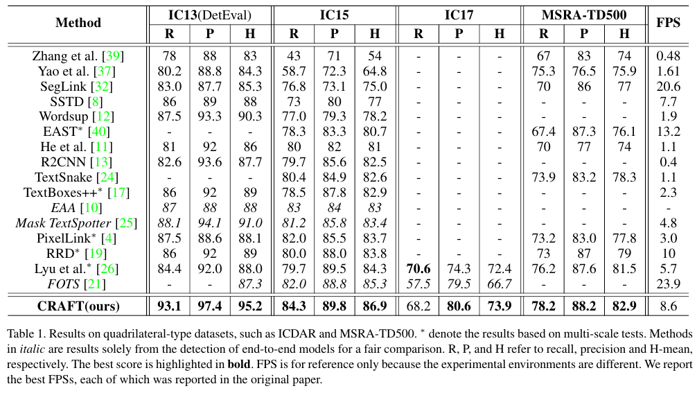 Table 1과 2를 보면 CRAFT가 대부분의 데이터에 대해서 최상의 성능을 달성함을 알 수 있다.