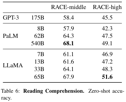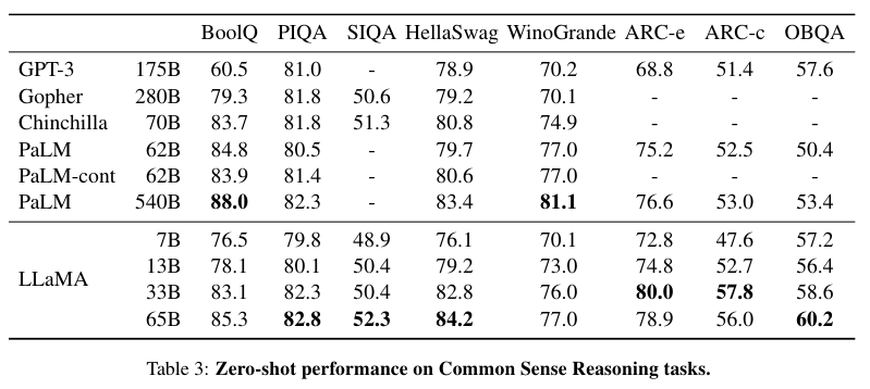 LLaMA-13B는 GPT-3 175B의 성능을 뛰어넘었으며 LLaMA-65B는 Chinchilla-70B와 PaLM-540B의 성능을 뛰어넘었다.