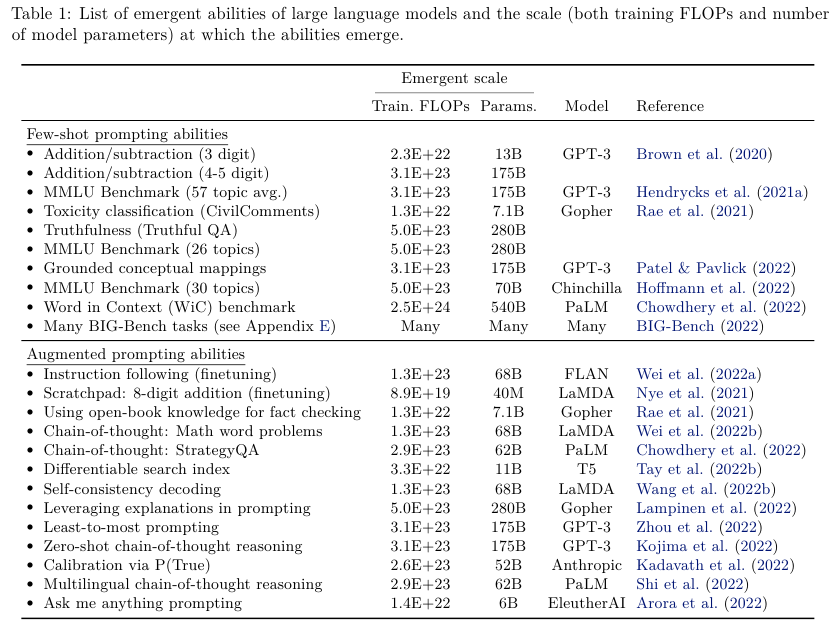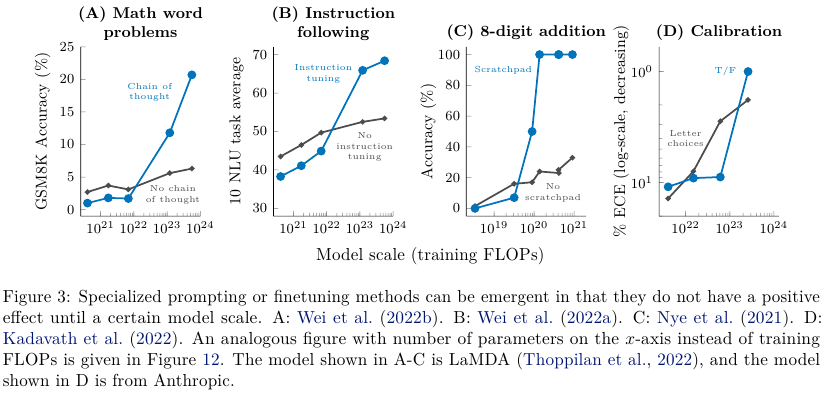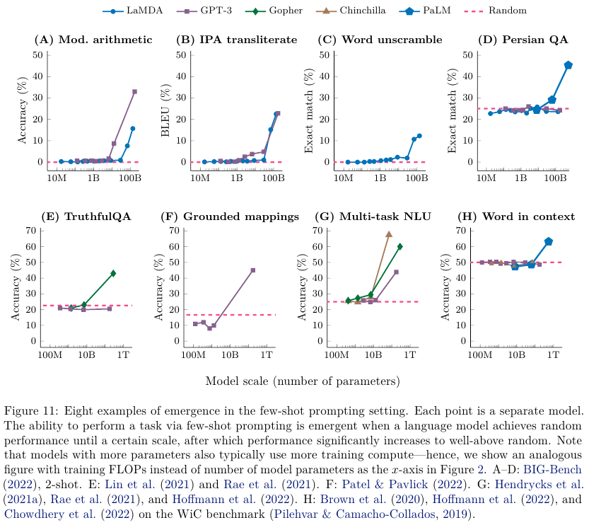 Emergent abilities, 예기치 않게 생겨난 능력이 LM 모델의 스케일을 키울 때 등장한다는 내용을 다룬 논문이다.