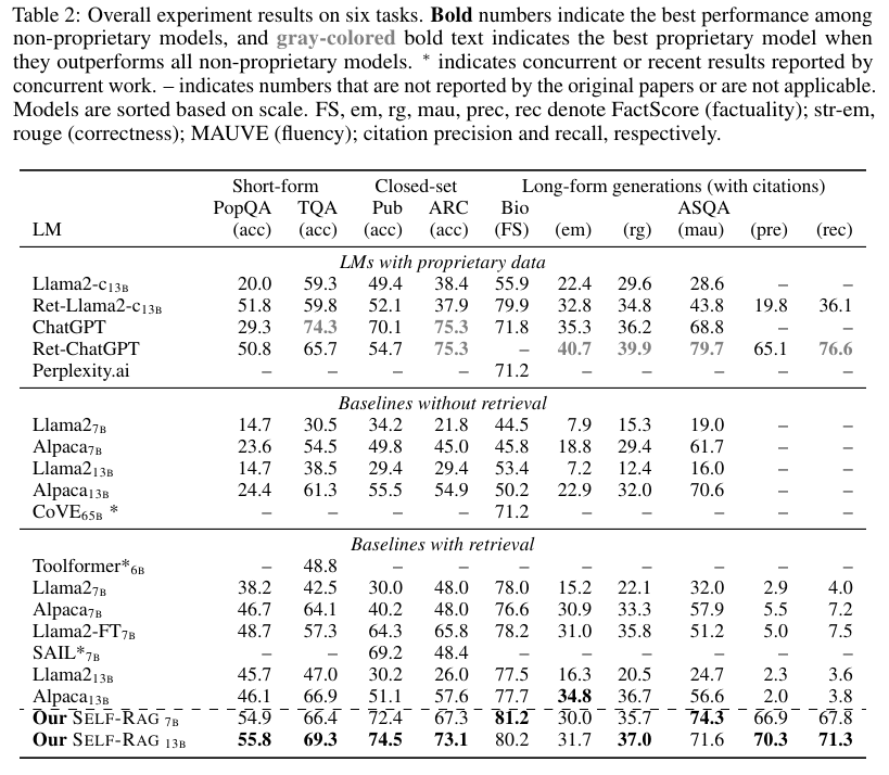 Long-form generations with citations 태스크인 Bio와 ASQA에 대해서 Self-RAG가 대체로 가장 좋은 성능을 달성했음을 보인다.