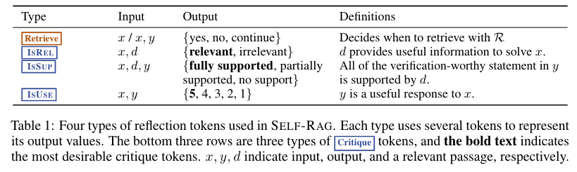 Reflection tokens는 아래 Table 1에 나와있다.