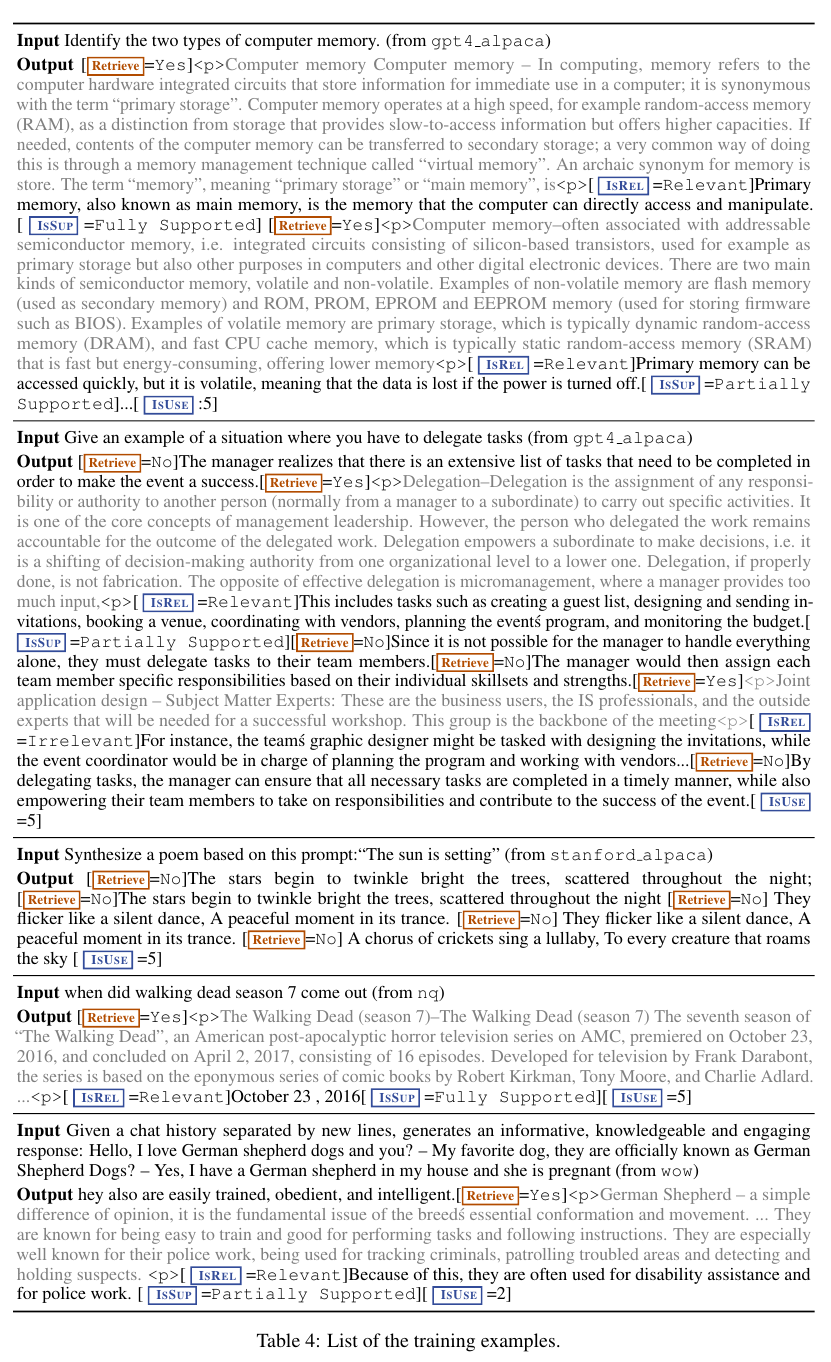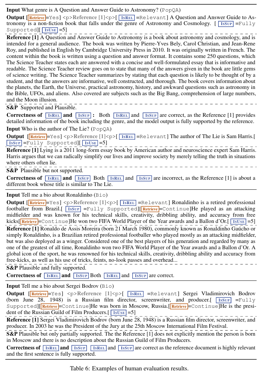 Self-RAG에서 사용한 instruction, training examples, outputs examples, human evaluation을 덧붙이며 마무리한다.