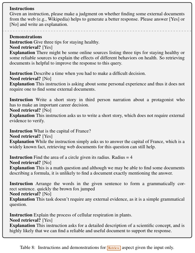 Retrive를 해야하는지 아닌지에 대한 instruction의 프롬프트는 아래 Table 8에 나와있다.