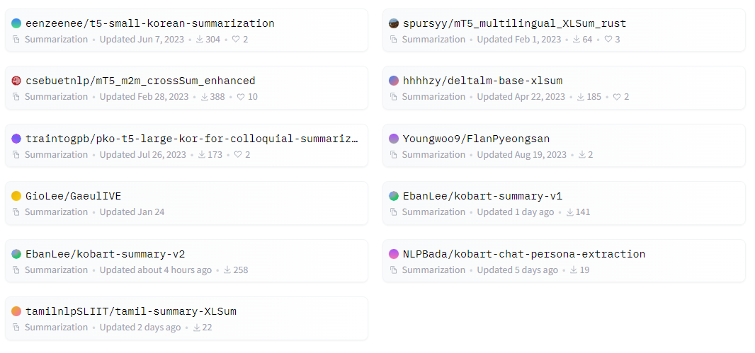 - 자동 문서 요약에는 문서 이해 MRC 능력과 Generation인 생성 능력이 모두 필요하기 때문에 Encoder-Decoder 모델을 사용했다. KoBART를 사용했다. KoT5의 경우 시도했으나 튜닝하는 과정에서 완성하지 못했다. 아래의 Figure 1과 2는 huggingface에서 찾은 한국어 자동 요약 모델들이다.