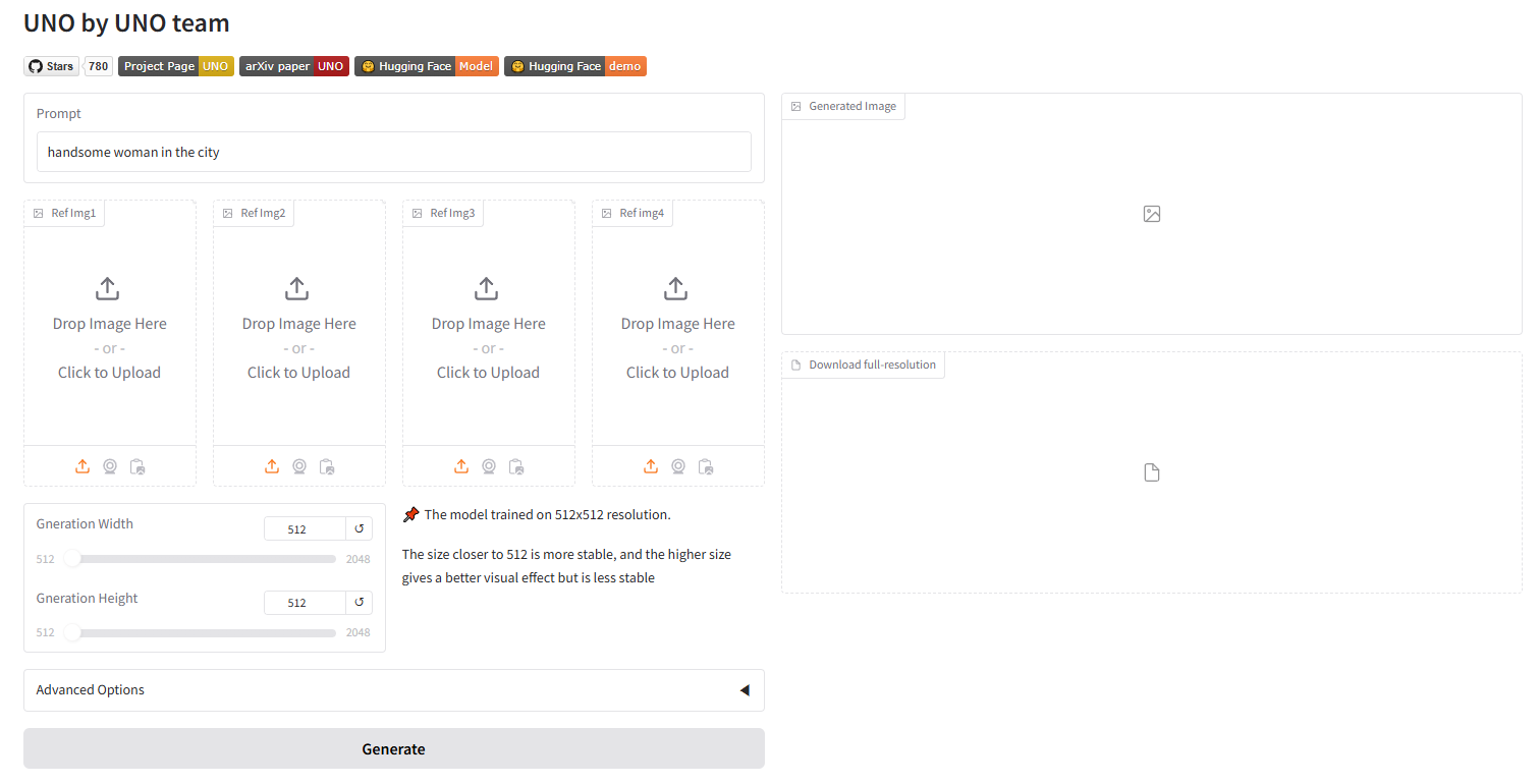 들어가서 확인해보니 UNO FLUX는 Stable Diffusion Web UI와 유사한 형태의 멀티모달 생성 모델임을 알 수 있다.