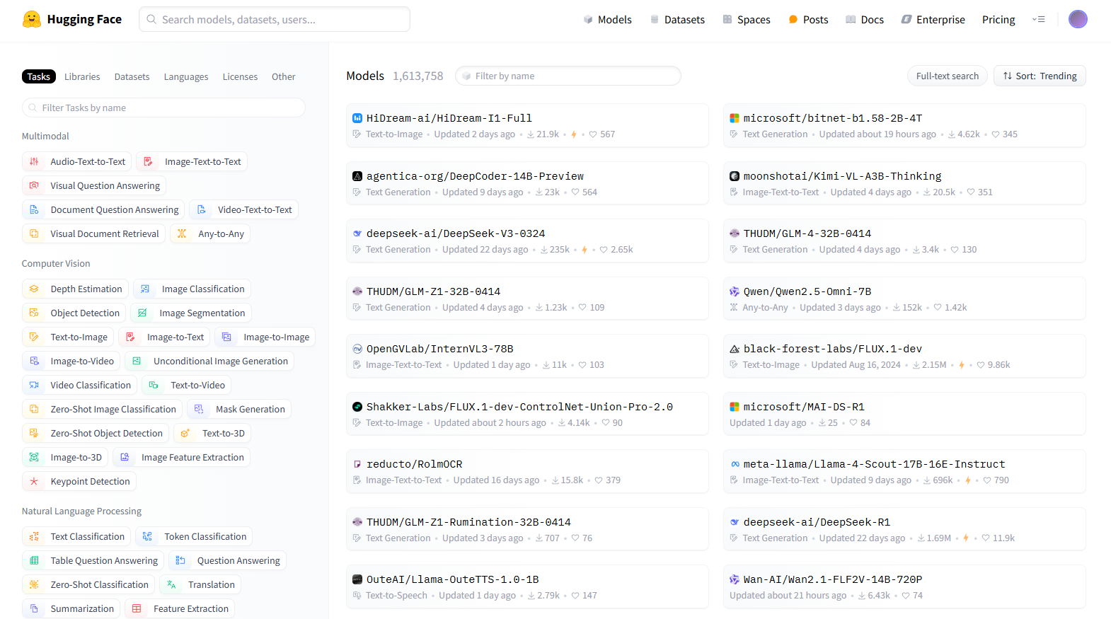 Tasks, 라이브러리, 데이터, 언어, 라이센스 등등을 기준으로 사용가능한 모델들을 확인할 수 있다.