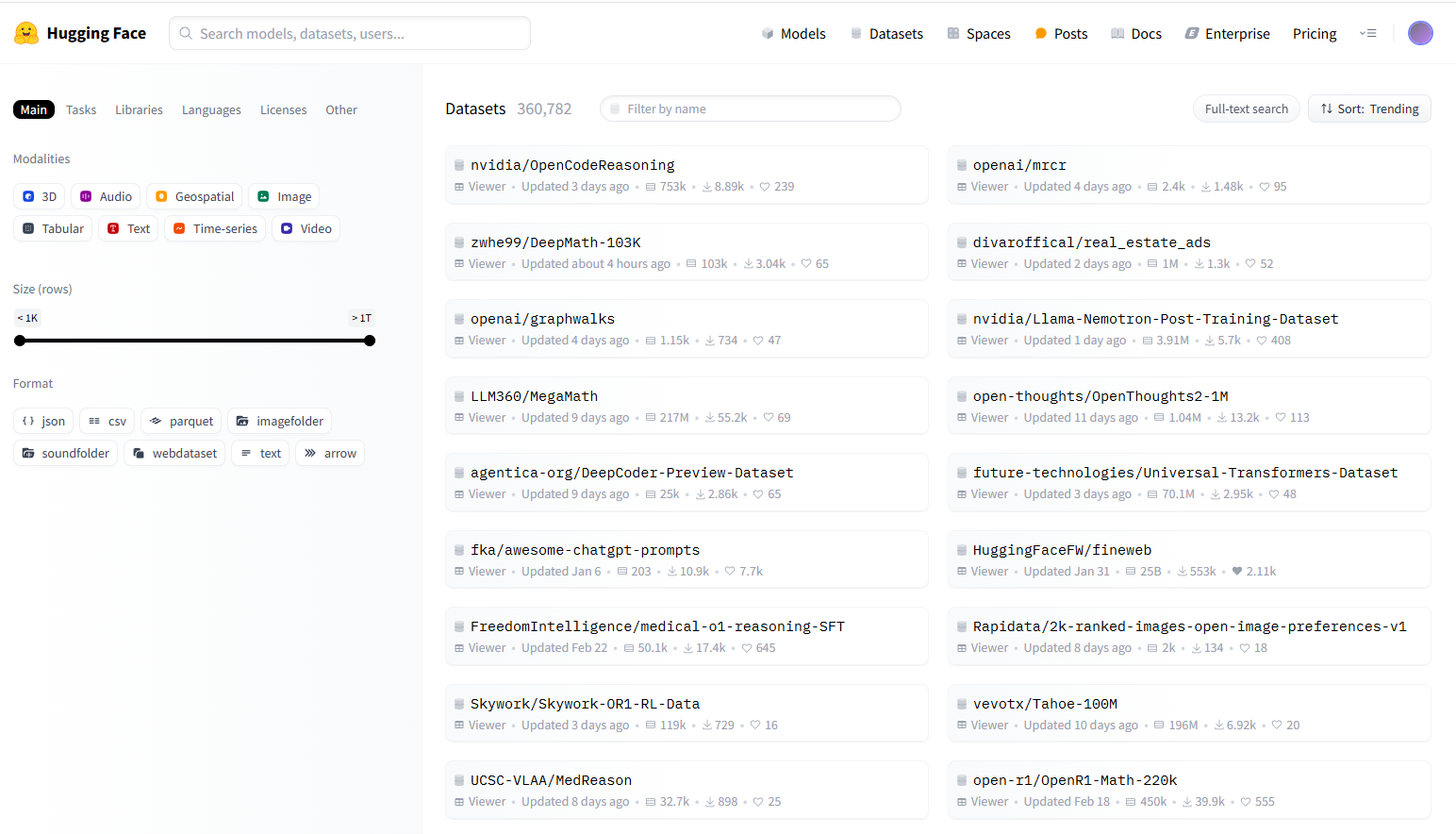 Tasks, 라이브러리, 데이터, 언어, 라이센스 등등을 기준으로 찾을 수도 있다.