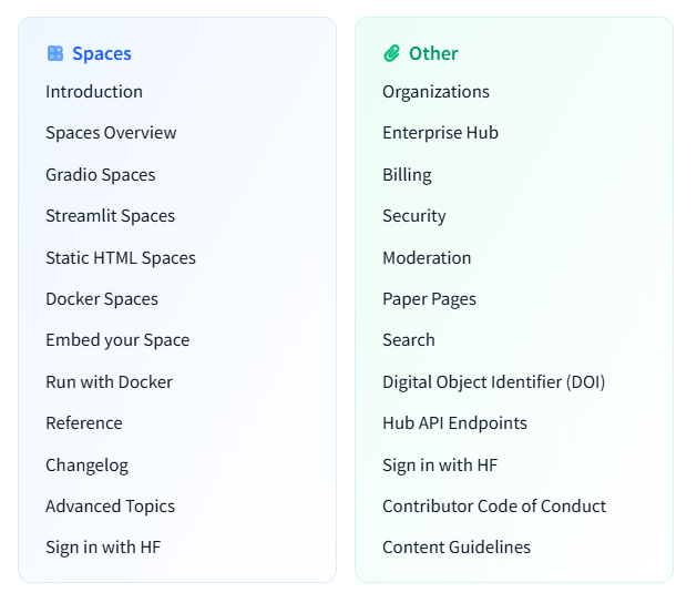 허깅페이스 허브 (문서 링크)는 허깅페이스에서 만든 플랫폼으로 모델, 데이터, 스페이스라는 데모 혹은 앱 형태를 지원한다.