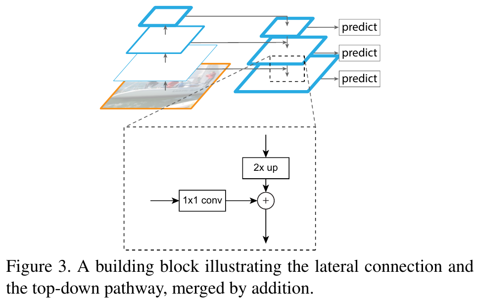 이렇게 만들어진 features를 bottom-up pathway에서 나온 features와 lateral connection의 방법으로 함께 사용해서 성능을 향상시킨다. Lateral connection 과정의 구체적인 연산은 addition 덧셈이다.