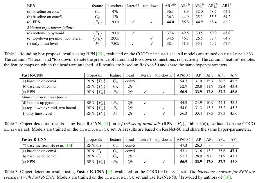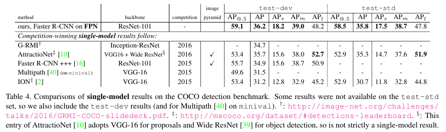 AttractionNet, Faster R-CNN, Multipath, ION 등과 비교했을 때 FPN이 SOTA를 달성했음을 알 수 있다.