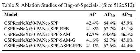 Additional blocks: SPP (Spatial Pyramid Pooling), ASPP (Atrous SPP), RFB (Receptive Field Block), SAM (Spatial attention Module)