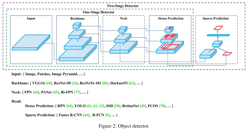 Path-aggregation blocks: FPN (Feature Pyramid Network), PAN (Path Aggregation Network), NAS-FPN, Fully-connected FPN, BiFPN, ASFF (Adaptively Spatial Feature Fusion), SFAM - Heads: