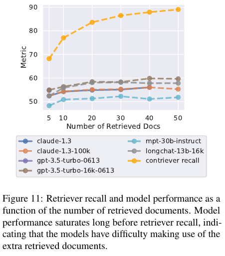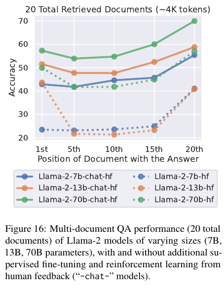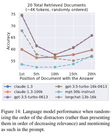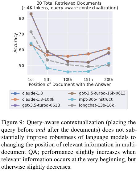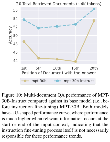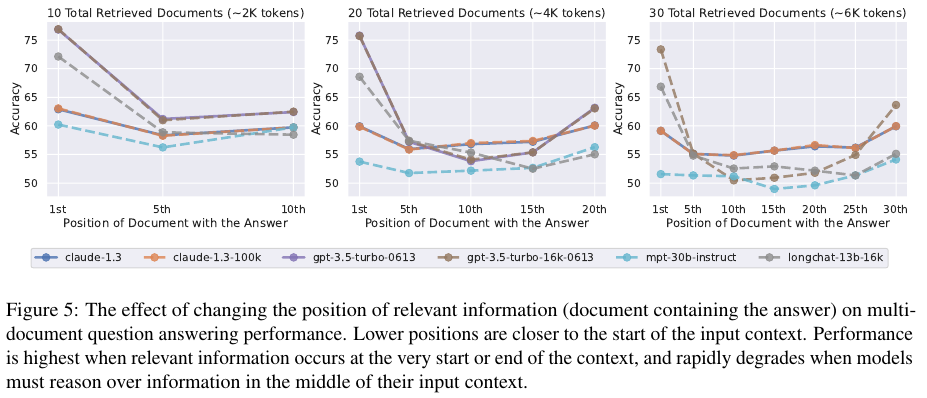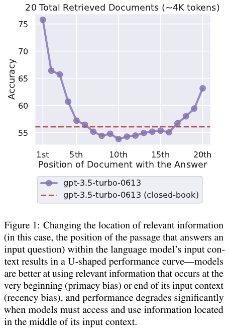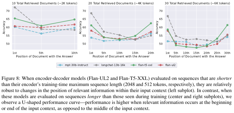 Long context를 사용할 때 relevant information 관련있는 정보의 위치에 따라서 성능이 급격하게 감소하는 현상을 발견했다. 따라서 현재의 언어 모델은 긴 입력 컨텍스트의 정보 활용에 있어서 로버스트하지 않음을 의미한다. 관련있는 정보가 처음와 끝에 위치할수록 좋은 성능이며, 이 정보가 중간에 놓일 경우 유의미하게 품질이 저하됨을 발견했다.