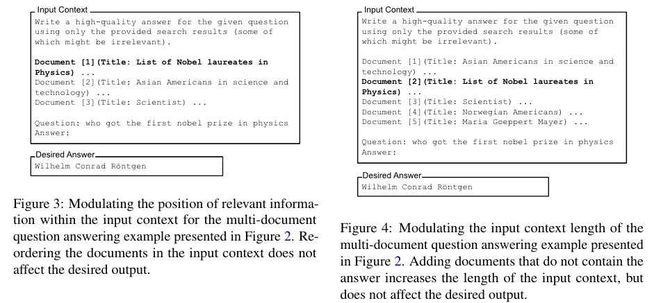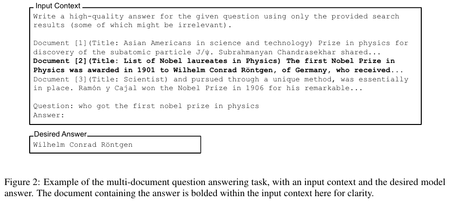 이를 위해 multi-document question answering을 선정했는데 이는 relevant information을 찾아내어 질문에 답하는 작업을 요구한다. 구체적으로 입력 컨텍스트와 관련있는 정보의 위치를 조정해서 태스크 성능의 차이를 측정한다.