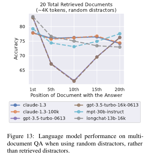 이 실험의 세팅은 needle-in-haystack 실험과 비슷하다. 관련있는 문서는 앞쪽에 위치하면 어떤지, 랜덤한 위치에 놓이면 어떤지를 탐구한다.