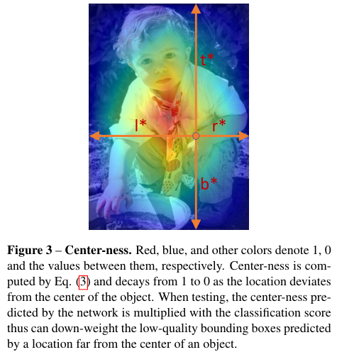 centerness* = $\sqrt{ \frac{min(l^*, r^*)}{ max(l^*, r^*) } \times \frac{min(t^*, b^*)}{ max(t^*, b^*) } }$