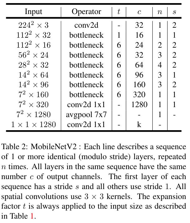 아래는 19 residual bottlenectk layers를 설명한 Table 2다.