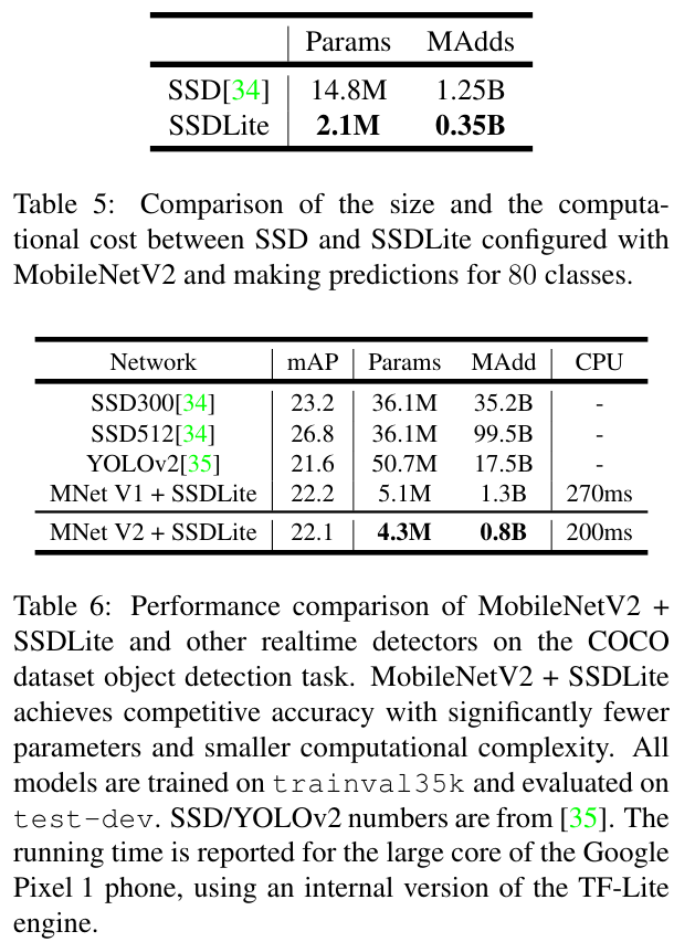 MNet V1과 V2를 적용한 SSDLite가 기존 SSD나 YOLOv2보다 훨씬 적은 파라미터 수로 견줄만한 성능을 달성했음을 보여준다.