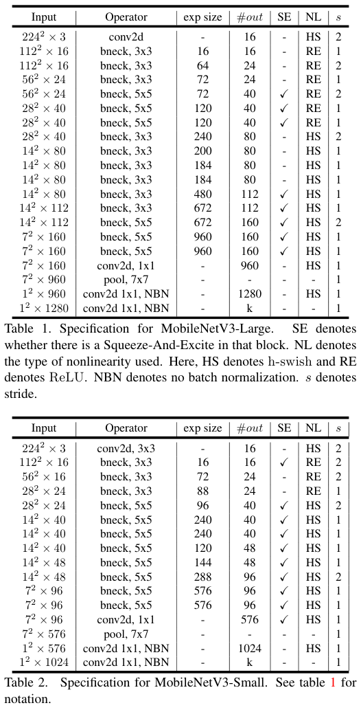 위 Table 1에서는 MobileNetV3-Large의 구조를, Table 2에서는 MobileNetV3-Small의 구조를 보여준다.