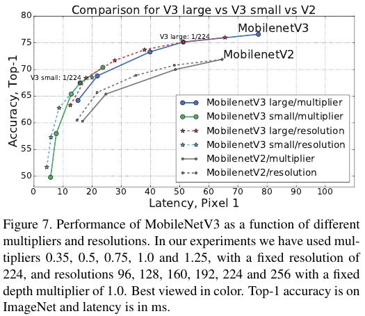 Figure 7은 MobileNet의 V2와 V3의 성능을 Latency와 Accuracy의 측면에서 비교하는 그래프다.