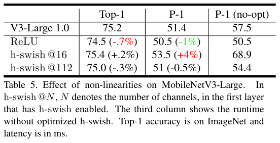 MobileNetV3-Large로 ReLU, h-swish를 비교한 실험인데 h-swish를 적용해서 약간 더 좋은 성능을 달성했음을 알 수 있다.
