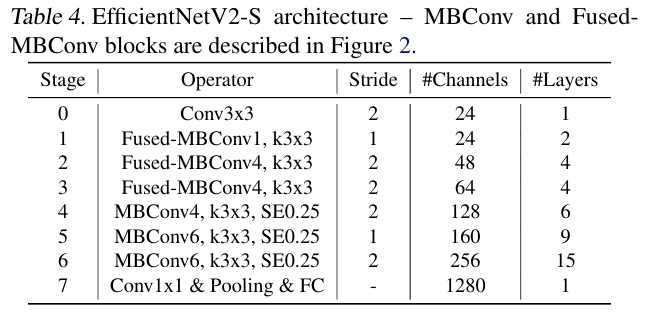 EfficientNetV2의 구조는 다음의 Table 4와 같다.
