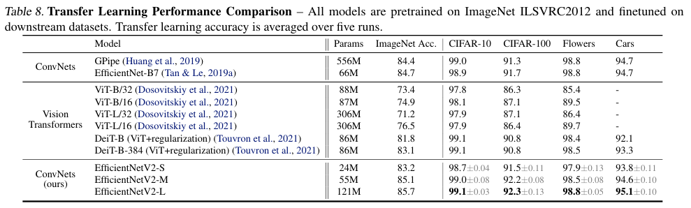 EfficientNetV2가 좋은 성능을 달성했음을 확인할 수 있다.