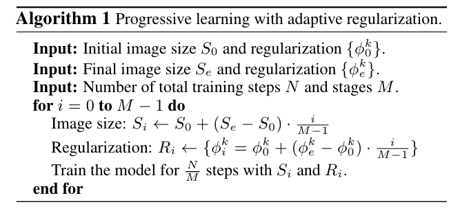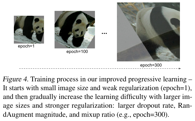 Figure 4는 improved progressive learning 개선된 점진적 학습의 과정을 나타낸다. 초기 학습 에포크에서는 더 작은 이미지와 약한 정규화로 네트워크를 학습시켜 네트워크가 간단한 표현을 쉽고 빠르게 학습할 수 있도록 유도한다. 그런 다음 이미지 크기를 점진적으로 늘리지만, 더 강력한 정규화를 추가하여 학습을 더욱 어렵게 만든다.