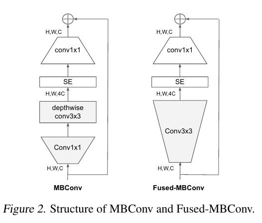최근 Fused-MBConv (Accelerator-aware neural network design using automl)가 소개되어 모바일이나 서버 가속기를 활용할 수 있게 되었다. 이는 MBConv의 depthwise conv 3x3와 expansion conv 1x1을 대체한다. (MBConv는 MobileNetV2에서 소개된 네트워크 구조다. MBConv와 Fused MBConv는 아래 Figure 2에 그림으로 묘사되어 있다.)