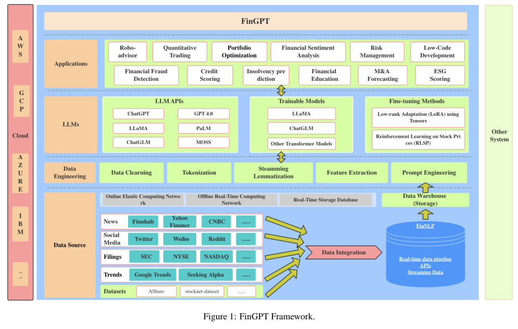 FinGPT는 full-stack 프레임워크로 아래의 4층의 레이어로 구성된다.