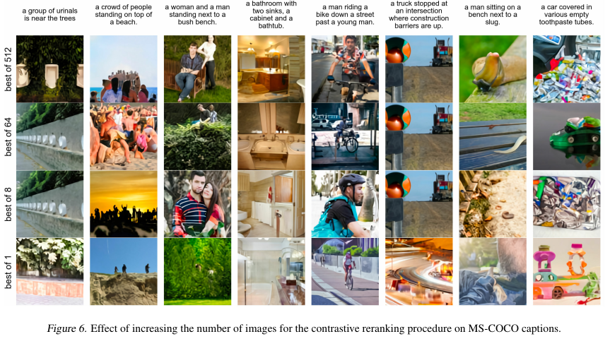 Generating Diverse High-Fidelity Images with VQ-VAE-2 (링크) 논문과 유사하게 contrastive model인 CLIP 모델 (블로그 링크)을 활용해서 샘플을 뽑을 다음 rerank를 수행했다. 주어진 캡션과 후보 이미지에 대해서 contrastive model이 score를 매기는 방법으로 얼마나 캡션과 이미지가 잘 부합하는지 평가했다. Figure 6에 샘플의 수 N과 top $k$ 이미지의 수에 따른 영향을 보여준다. 최종적으로 N = 512, temperature reduction t = 1로 결정했다.