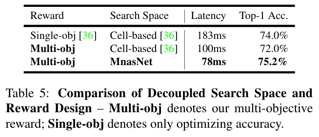 MnasNet에서는 single-obj이 아니라 Multi-obj을 사용하는게 Latency과 Top-1 Acc 양쪽 측면에서 더 좋다는 실험 결과를 Table 5가 보여준다. Single-obj는 accuracy만을 reward로 학습했을 때의 결과다.