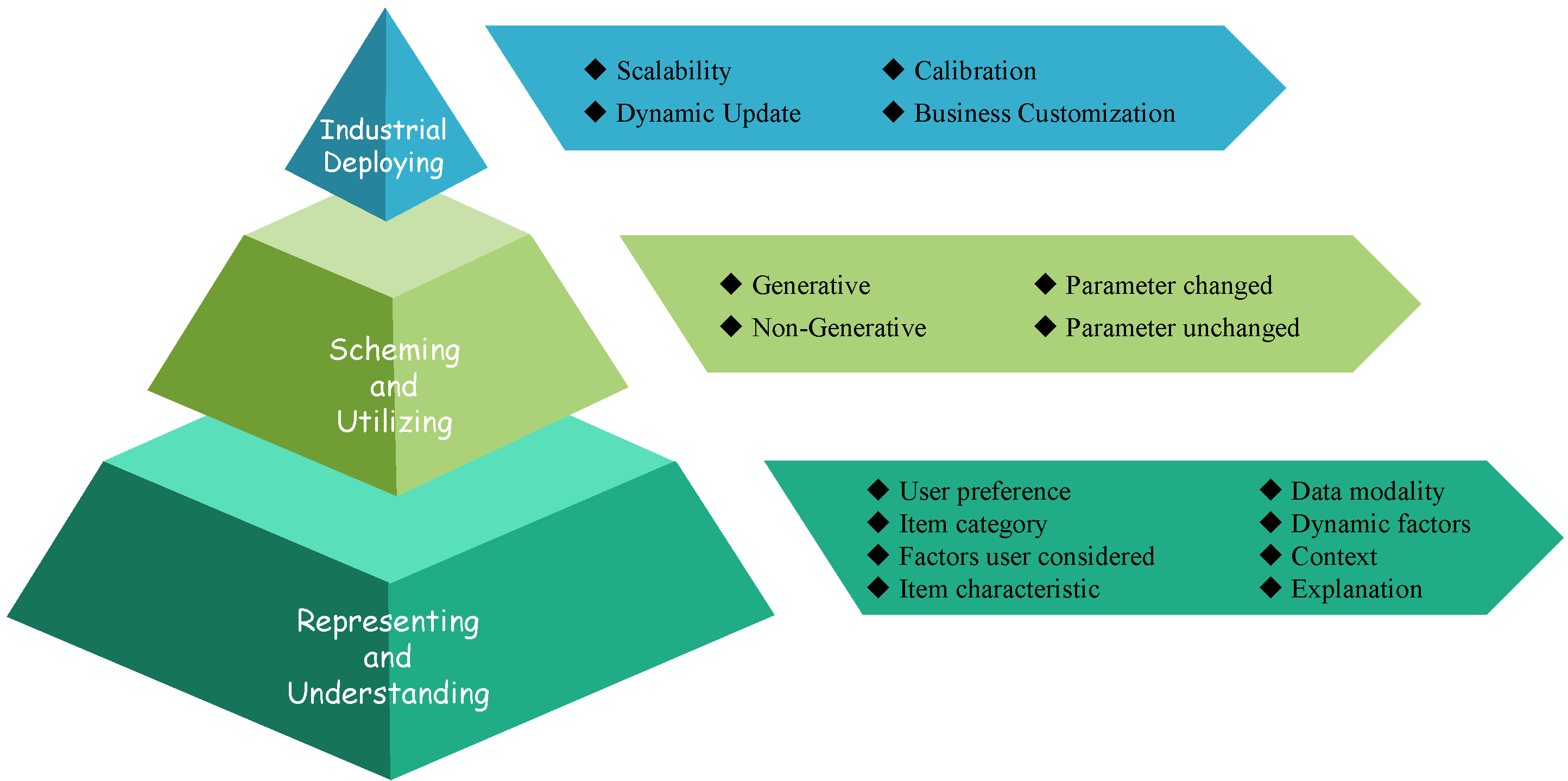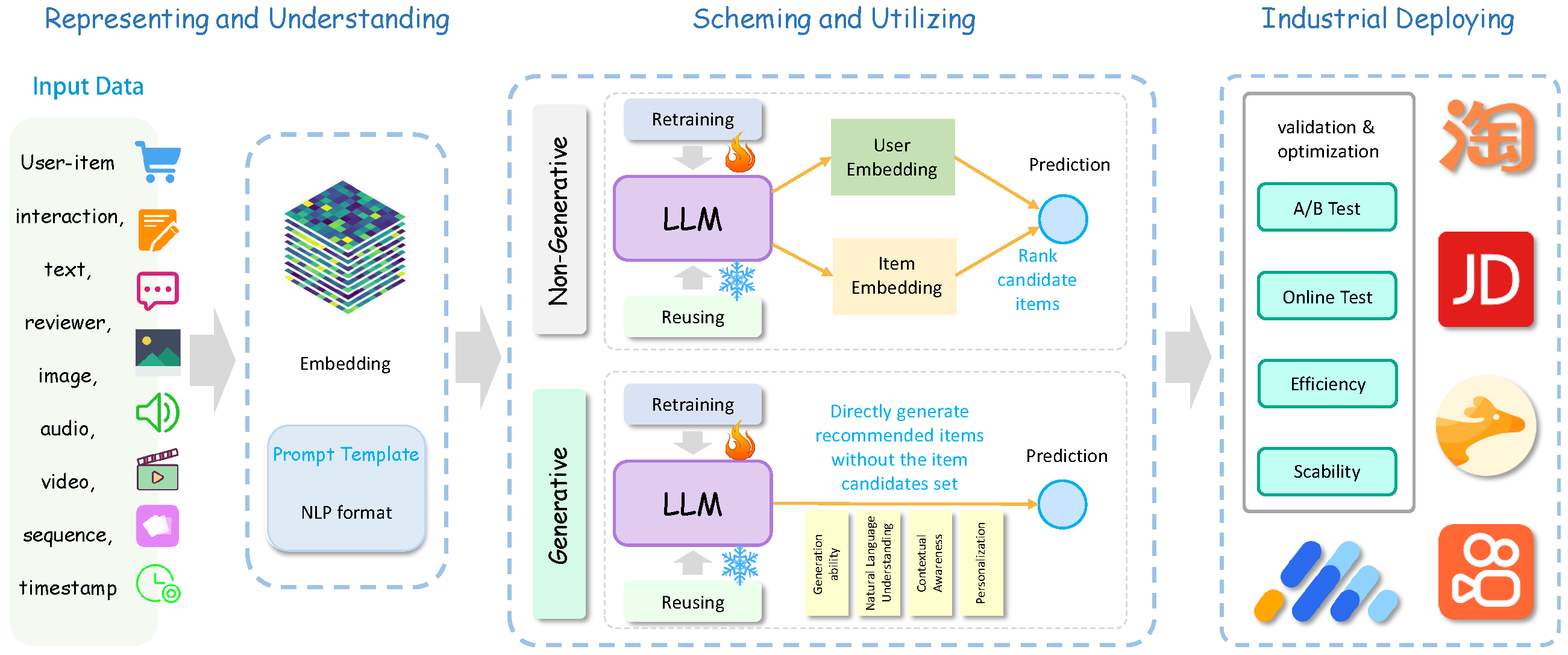 Representing and Understanding → Scheming and Utilizing → Industrial Deploying의 순서로 추천이 이루어진다.